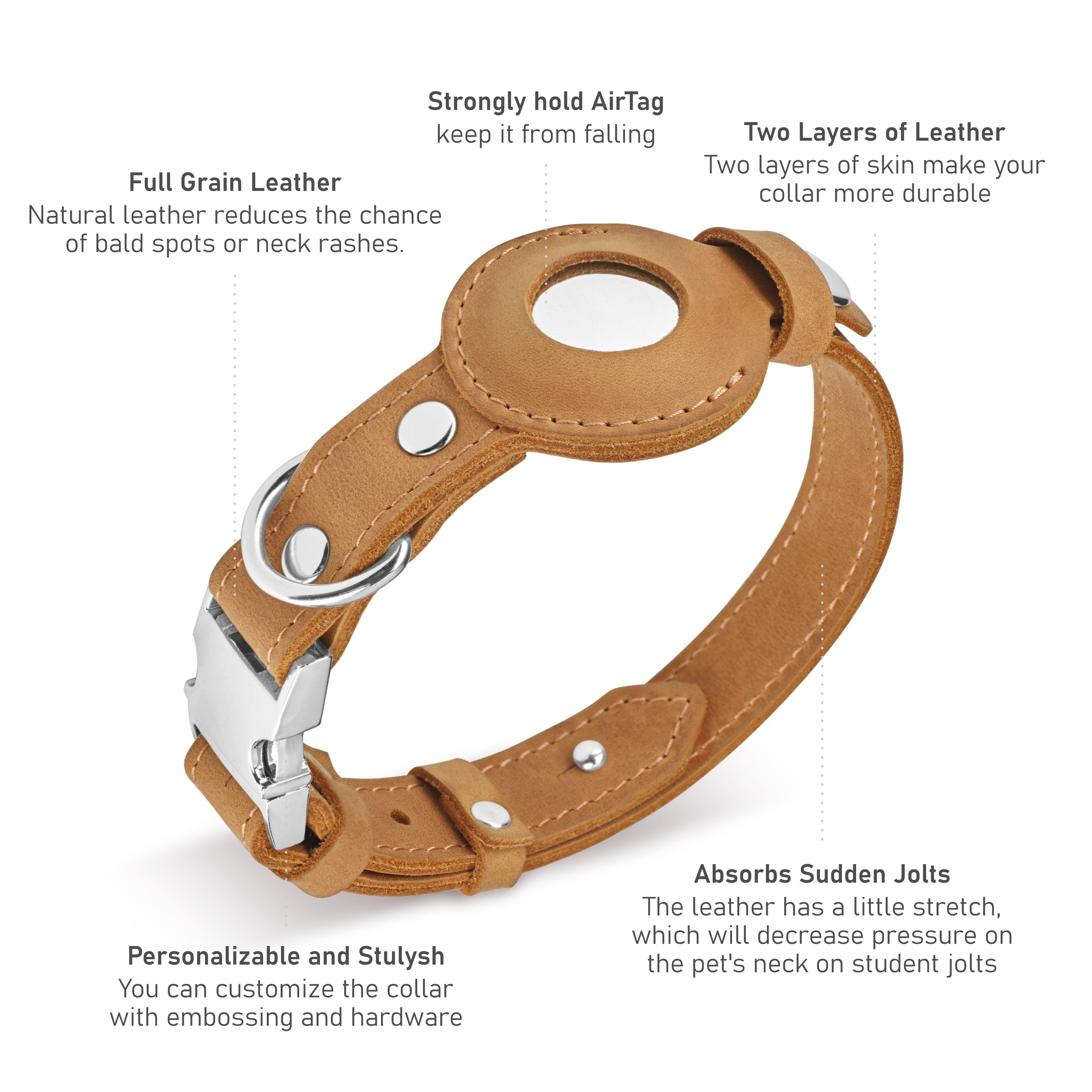 Engraved Handmade Leather AirTag Dog Collar is expertly crafted from premium genuine leather to offer both style and durability. Each collar is meticulously made to provide a comfortable fit for your dog while ensuring lasting quality.