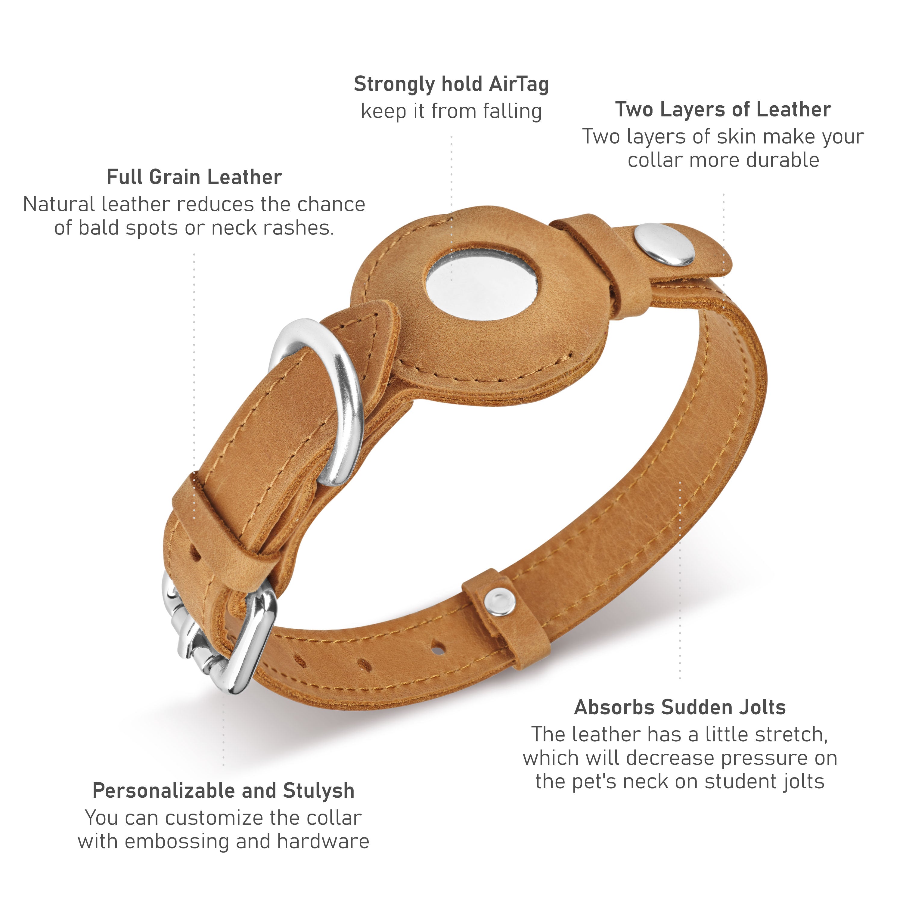 Our Handmade Leather AirTag Dog Collar is expertly crafted from premium genuine leather to offer both style and durability. Each collar is meticulously made to provide a comfortable fit for your dog while ensuring lasting quality.